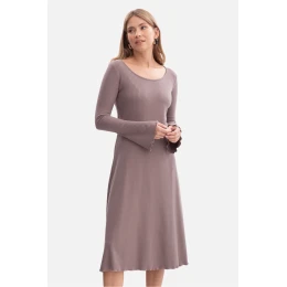 Šaty jsou vyrobeny z měkké, pruhované látky o gramáži 250 g, která poskytuje pohodlí a přirozené přizpůsobení postavě. Model se obléká přes hlavu, bez kapes a podšívky, udržovaný v lehké a ženské formě. Klasický, kulatý výstřih s jemným výstřihem zdůrazňuje krk, a dlouhé rukávy lehce rozšířené u manžet dodávají celku jemnou eleganci. Ozdoby ve formě vlnitého lemu a zakončení rukávů vnášejí do celku nádech romantické lehkosti. Střih spojuje přiléhavý vrchní díl s lehce rozšířeným spodkem, což krásně modeluje postavu a zajišťuje volnost pohybu. Midi délka, sahající do poloviny lýtek, dodává šatům univerzální, nadčasový charakter. Navrženo a ušito v Polsku z látky vyrobené v Lodži, toto spojení kvality, ženské elegance a místního řemesla.