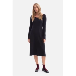 Šaty vyrobené z měkké, pruhované pleteniny o gramáži 250 g, která poskytuje pohodlí a přirozené přizpůsobení postavě. Model nasazovaný přes hlavu, bez kapes a podšívky, udržovaný v lehké a ženské formě. Klasický, kulatý výstřih s decentním výstřihem zdůrazňuje krk, a dlouhé rukávy lehce rozšiřující se u manžet dodávají celku jemnou eleganci. Ozdoby ve formě vlnitého lemu a završení rukávů vnášejí do celku nádech romantické lehkosti. Střih spojuje přiléhavý vršek s lehce rozklosovaným spodkem, co krásně modeluje postavu a zajišťuje volnost pohybu. Midi délka, sahající po polovinu lýtek, dodává šatům univerzální, nadčasový charakter. Navrženo a ušito v Polsku z pleteniny vyrobené v Lodzi, je to spojení kvality, ženské elegance a místního řemesla.