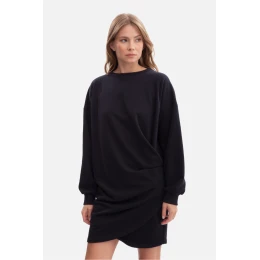 Ženské šaty ušité z hladké pleteniny s gramáží 280 g s podšívkou v smyčce, která je měkká, odolná a příjemná na nošení. Model nasazovaný přes hlavu, bez kapes a podšívky, navržen s ohledem na pohodlí a moderní styl. Klasický kulatý výstřih pod krkem zdůrazňuje sportovní charakter, a dlouhé rukávy s opuštěnou linií ramen, zakončené manžetami, dodávají siluetě volný volný efekt. Střih kombinuje volný vrch v oversized stylu s přizpůsobenými boky, což dělá šaty zároveň pohodlné a ženské. Délka mini, sahající do poloviny stehen, přidává lehkost a moderní charakter, ideální pro každodenní stylování. Navrženo a ušito v Polsku z pleteniny vyrobené v Lodži, je to návrh, který spojuje sportovní volnost s ženským akcentem a vysokou kvalitou zpracování. Lem: 95% bavlna, 5% elastan.