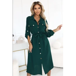 Toto elegantné zelené midi sako je dizajnom, ktorý spája klasiku s moderným štýlom. Jednoduchý strih košeľových šiat bol navrhnutý s ohľadom na ženy, ktoré oceňujú pohodlie a nadčasovú eleganciu. Zapínanie na gombíky, opasok v páse a náprsné vrecká mu dodávajú charakter, zatiaľ čo kapucňové rukávy zaručujú, že model je ideálny na rôzne príležitosti a ročné obdobia. Univerzálna midi dĺžka a tanierový strih zaručujú, že silueta pôsobí štíhlo a proporčne. Sako je vhodné do kancelárie, na rodinné stretnutia alebo elegantné večery.
