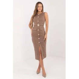 Tieto elegantné každodenné šaty v ceruzkovom strihu sú všestrannou voľbou na každý deň aj do práce. Sú vyrobené zo zmesi viskózy, nylonu a elastanu a poskytujú pohodlie, pružnosť a elegantné prispôsobenie postave. Model v midi dĺžke, bez rukávov, s okrúhlym výstrihom a skrytým zipsom na chrbte zaručuje pohodlie a elegantné prevedenie. Šaty majú našité vrecká so záložkami, ktoré im dodávajú praktickosť, a ozdobné gombíky vpredu vnášajú jemný dekoratívny prvok. Jemné rozparky vpredu na spodnej časti dodávajú celku ľahkosť a uľahčujú pohyb, čím elegantným spôsobom zdôrazňujú ženskú siluetu.