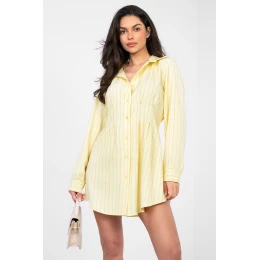Elegantní košilové šaty s knoflíky jsou stylovým návrhem pro ženy, které ocení klasiku v moderním provedení. Model s mini délkou a rozkvetlým střihem krásně zdůrazňuje pas a dodává postavě lehkost a proporcionálnost. Šaty jsou vyrobeny z vysoce kvalitní směsi polyesteru, viskózy a elastanu, díky čemuž jsou pohodlné na nošení, jemně elastické a dobře padnou na postavě. Pruhový vzor dodává šatům nadčasový charakter a jemnou eleganci. Model má klasický límeček a dlouhý rukáv, co podtrhuje košilový styl a dělá šaty skvělým prvkem jak do práce, tak na formální události. Na přední straně jsou ozdobné švy, zatímco záhyby na zádech v oblasti pasu dále zdůrazňují pas a zajistí lepší přizpůsobení. Jedná se o univerzální model, který spojuje eleganci s pohodlím, ideální jak do kanceláře, tak na speciální události.