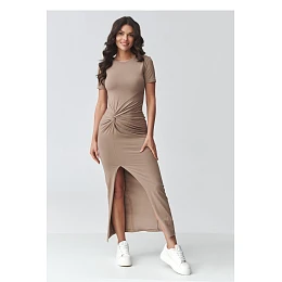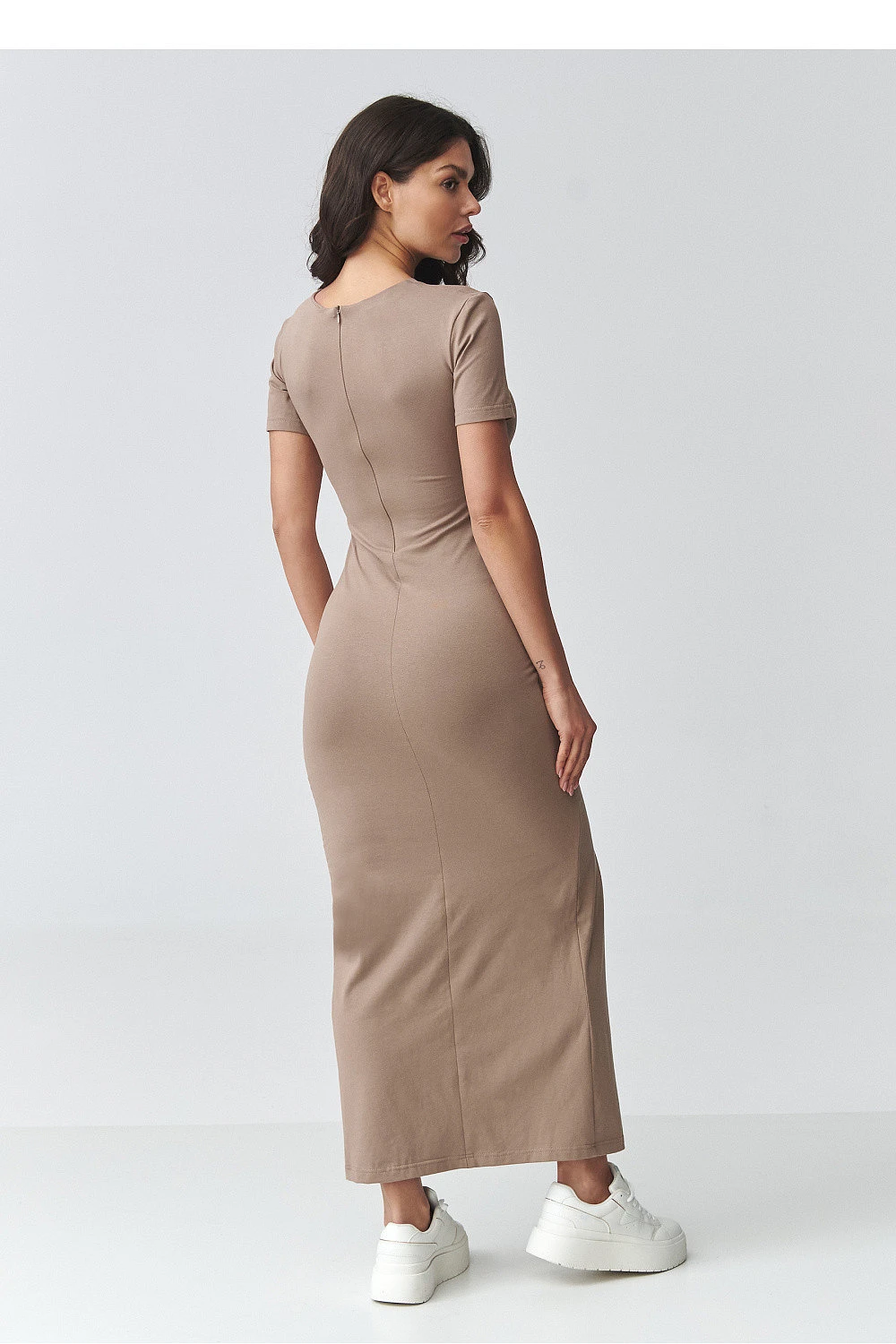 Elegantní šaty s drapováním jsou nabídkou pro ženy, které si cení spojení klasiky a moderních detailů. Přiléhavý střih zdůrazňuje postavu a jemné drapování v pasu tvaruje figuru a dodává celku výjimečný charakter. Jedná se o ideální dámské šaty na speciální příležitosti, obchodní schůzky a stylové vycházky. Model má klasický, zakrytý výstřih a krátké rukávy, co z ní dělá minimalistický a nadčasový vzhled. Ozdobné drapování v centrální části krásně zdůrazňuje pas, zatímco efektní rozparkem vpředu prodlužuje nohy a dodává ženskou lehkost. Maxi délka z ní dělá elegantní šaty vhodné na mnoho různých příležitostí. Vyrobena z elastického, pohodlného materiálu, přiléhavé šaty zaručují pohodlí po celý den. Skvěle se hodí jak k sportovní obuvi v casual stylu, tak k elegantním doplňkům, vytvářejícím formálnější stylizaci.