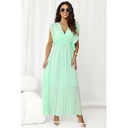 Rozklosowana midi šaty jsou ideální volbou pro letní dny, spojující lehkost, pohodlí a ženský styl. Skvěle se hodí do každodenních outfitů, poskytují volnost pohybu a elegantní vzhled. Model vyrobený z vysoce kvalitní směsi polyesteru, viskózy a elastanu je lehký, příjemný na dotek a dobře padne na postavě. Hladký vzor zdůrazňuje univerzální charakter šatů, díky čemuž je snadné je kombinovat s různými doplňky. Šaty mají přesýpací výstřih, který decentně zdůrazňuje krk a dodává celku ženskou eleganci. Bez rukávů se model skvěle hodí do teplých dní. V pasu je šňůrka ve formě šály, která umožňuje ideální přizpůsobení a zvýraznění postavy. Dekorativní volánky po stranách ve horní části šatů dodávají lehkost a romantický styl. Spodek od pasu je plisovaný, co krásně padne v pohybu a zdůrazňuje rozkloslý střih. Další výhodou je podšívka dlouhá po kolena, která zvyšuje pohodlí nošení a zajišťuje lepší uspoř