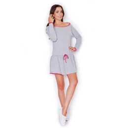 Nezvyčajné šaty športového strihu. Rozdelené v páse a zviazané šnúrkou. Rukávy sú zakončené švami. Mini dĺžka zvodne odhaľuje nohy. Šaty sú vyrobené z teplákového úpletu. Ideálna voľba na každodenné nosenie. Venované mladým, dynamickým ženám.