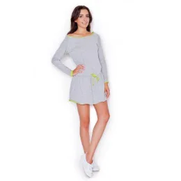 Nezvyčajné šaty športového strihu. Rozdelené v páse a zviazané šnúrkou. Rukávy sú zakončené švami. Mini dĺžka zvodne odhaľuje nohy. Šaty sú vyrobené z teplákového úpletu. Ideálna voľba na každodenné nosenie. Venované mladým, dynamickým ženám.