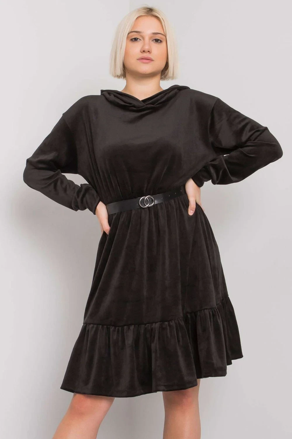 Voľné velúrové šaty s dlhými rukávmi. Šaty s kapucňou, volánom na spodnej časti a opaskom. Skvelé na mnoho príležitostí. Bavlna 95 %