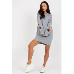Mikinové šaty s dlhými rukávmi a okrúhlym výstrihom. Rukávy sú zdobené zaujímavou výšivkou a na bokoch sú vrecká.