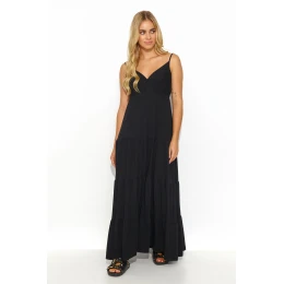 Tieto dlhé letné šaty, rozdelené na segmenty, ktoré imitujú jemné volány, sú kvintesenciou ľahkosti a romantiky. Šaty sa viažu tenkými šnúrkami, ktoré im dodávajú jedinečnú jemnosť a voľnosť pohybu. Prekrývajúci sa výstrih do V jemne zvýrazňuje poprsie a dodáva kreácii ženský pôvab. Ozdobná zlatá platnička všitá do zadnej časti dodáva šatám eleganciu a jedinečný šarm. Letná kreácia sa dodáva v rôznych farbách, aby vyhovovala individuálnym preferenciám a štýlu.