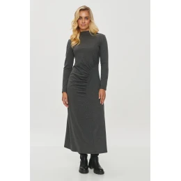 Drapované šaty vytvářejí elegantní a minimalistický návrh, který kombinuje jednoduchost se subtilními detaily. Model má midi délku sahající do poloviny lýtek, co jí dodává eleganci a klasický vzhled. Střih je jednoduchý, ale s efektním akcentem v podobě záhybu na levé straně pasu, který šatě dodává tvar a zdůrazňuje siluetu. Model má dlouhé rukávy, které zajišťují pohodlí a dělají z něj vhodný model na chladnější dny. Vysoký límec dodává šatě eleganci, zatímco ji udržuje v casual stylu. Drapování v oblasti pasu je jemný detail, který jí dodává dynamiku a lehkost, jemně zdůrazňující ženské tvary. Díky neutrálním barvám lze šaty snadno kombinovat s různými doplňky, jak v elegantním, tak i více casual stylu. Model je ideální pro ženy, které ocení pohodlí, jednoduchost, ale zároveň nevzdávají se ženského stylu. Můžete ji zkombinovat se sportovní obuví a získat outfit s moderním a sportovním charakterem. Taková styl