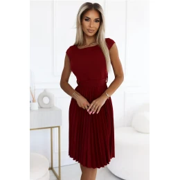 Šaty Lila od značky Numoco sú plisované, elegantné, s krátkymi rukávmi a v módnej bordovej farbe. Opasok v páse jemne zvýrazňuje siluetu a dodáva ženský šarm, zatiaľ čo krytý zips na chrbte zaručuje pohodlné obliekanie a estetický vzhľad. Tieto šaty sú ideálne na formálne a poloformálne príležitosti, spájajú módny dizajn s pohodlným nosením. Sú vyrobené v Poľsku a zaručujú vysokú kvalitu spracovania a pozornosť venovanú detailom.