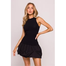 Moderní šaty s kontrastním střihem, které spojují pohodlí a styl. Horní část je vyrobena z měkké, prodyšné bavlněné pleteniny, která se přizpůsobí postavě jako tílko s širokými ramínky a vysokým, kulatým výstřihem. Spodek je ušitý z pevné košilové látky, která mu dodává efektní objem ve tvaru krátké, rozkvetlé ?bomby?. Šaty nemají kapsy ani zapínání, snadno se oblékají přes hlavu. Trup ve tvaru písmene X a balonový, miniaturizovaný spodek vytvářejí zajímavou kombinaci sportovní funkčnosti s ženskou formou. Navrženo a ušito v Polsku s ohledem na moderní siluety a originální styl. Horní část: 95% bavlna, 5% elastan Spodek: 55% nylon, 42% bavlna, 3% spandex