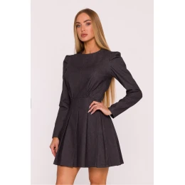 Šaty vyrobené z látky imitující džínovinu jsou elegantní a moderní volbou, ideální na mnoho příležitostí. Materiál je lehce tuhý, matný a jemně elastický, díky čemuž krásně drží tvar a zdůrazňuje střih. Model má klasický, kulatý výstřih a dlouhé rukávy s jemnými záložkami na ramenou, které dodávají siluetě výraz a eleganci. Přiléhavý vrchní díl plynule přechází do rozšířeného spodního dílu s kontrafašonky, vytvářející ženskou, harmonickou linii. Skrytý zip vzadu zajišťuje pohodlné oblékání a absenci podšívky činí šaty lehkými a pohodlnými k nošení. Střih zdůrazňuje pas, akcentuje ramena a krásně modeluje postavu. Mini délka dodává celku moderní charakter a jemně odhaluje nohy, díky čemuž se kreace skvěle hodí jak na každodenní nošení, tak na speciální události. Navrženo a ušito v Polsku s důrazem na detaily a ženskou siluetu.