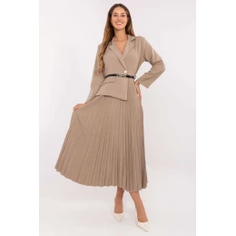 Elegantné maxi šaty s rozšíreným strihom, ktoré sú ideálne do práce aj na spoločenské udalosti. Vrchná časť v námorníckom štýle s klasickým golierom a gombíkovou légou dodáva celku eleganciu a profesionalitu. Od pása nadol sú šaty vyrobené z plisovanej látky, ktorá sa pri pohybe krásne skladá a zdôrazňuje ľahkosť a ženský pôvab. Dlhé rukávy dodávajú eleganciu a zopnutý pás zvýrazňuje pás a dodáva postave proporcie. Celkový vzhľad je zachovaný hladký a prevažujúca zmes viskózy a polyesteru zaručuje pohodlie pri nosení a odolnosť materiálu.