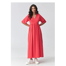 Elegantní maxi šaty jsou ideální kombinací pohodlí a nadčasové elegance. Jejich volný a uvolněný střih krásně padne na postavě, zajistí pohodlí po celý den. Jemný výstřih ve tvaru písmene V decentně zdůrazňuje linii krku, a odstřižení pod prsy dodává celku lehkost a ženský charakter. Dlouhé šaty jsou vyrobeny z příjemného na dotek, prodyšného materiálu, který se osvědčí jak v teplejších dnech, tak i ve vrstvených stylizacích. Krátké rukávy a rozparky po stranách jí dodávají moderní vzhled a volnost pohybů. Šaty skvěle ladí s doplňky od sportovních tenisek po elegantní sandály nebo kotníkové boty. Jedná se o univerzální dámské šaty, které se hodí na mnoho příležitostí do práce, na procházku, setkání s přáteli nebo dovolenou.