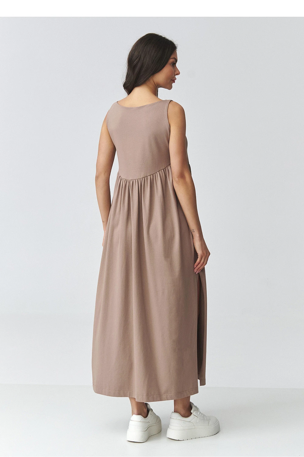 Elegantní maxi šaty s volným střihem jsou ideální volbou pro ženy, které ocení pohodlí a nadčasový design. Model má decentně rozšířený spod a efektní rozparky po stranách, které dodávají lehkost a zdůrazňují postavu. Hladký tvar zaručuje, že šaty budou skvěle vypadat jak na běžné nošení, tak i ve více elegantních stylizacích. Použitý prodyšný materiál zajistí pohodlí po celý den a volný střih zaručí volnost pohybu. Praktické kapsy zvyšují funkčnost a zabudovaný vršek s jemným zástřihem v pasu decentně modeluje proporce postavy. Jedná se o univerzální dlouhé dámské šaty, které snadno zkombinujete jak s sportovní obuví, tak i s elegantnějšími doplňky. Skvělé na procházku, schůzku, dovolenou nebo každodenní vycházky.