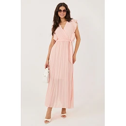 Rozklosowana midi šaty jsou ideální volbou na letní dny, spojující lehkost, pohodlí a ženský styl. Skvěle se hodí do každodenních outfitů, poskytují volnost pohybu a elegantní vzhled. Model je vyroben z vysoce kvalitní směsi polyesteru, viskózy a elastanu, je lehký, příjemný na dotek a dobře padne na postavě. Hladký vzor zdůrazňuje univerzální charakter šatů, díky čemuž se snadno sladí s různými doplňky. Šaty mají přesýpací výstřih, který decentně zdůrazňuje krk a přidává celkově ženskou grácii. Bez rukávů se tento model skvěle hodí na teplé dny. V pasu je šňůrka ve formě šátku, která umožňuje ideální přizpůsobení a zdůraznění postavy. Ozdobné volánky po stranách v horní části šatů dodávají lehkosti a romantického stylu. Spodek od pasu je plisovaný, co krásně padá v pohybu a zdůrazňuje rozklosowý střih. Další výhodou je podšívka dlouhá po kolena, která zvyšuje pohodlí nošení a zajistí lepší uspořád
