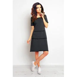 Dámske denné šaty nad kolená, okrúhly výstrih, krátke rukávy. Predné vrecko.
