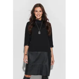 Jednoduché a ležérne šaty nadrozmernej veľkosti so stojatým golierom dokonale doplnia váš pracovný vzhľad. Šaty sú k dispozícii v čiernej farbe a kombinujú mikinový úplet s elegantnou matnou ekokožou. Rukávy poskytujú dostatočnú voľnosť pohybu. Dĺžka pod kolená zvýrazňuje nohy v ich najštíhlejšej časti. Preto sa šaty dajú nosiť voľne s čižmami alebo topánkami. Na zadnej strane šiat je kožená nášivka s logom Numinou. Ideálny strih pre ženy, ktoré sa cítia sebavedomo vďaka voľnosti brucha a ramien.