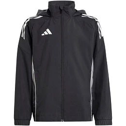 Dětská bunda adidas Tiro 25 Competition All Weather černá IW0448 Dětská bunda adidas Tiro je ideální na trénink, má zip po celé délce pro rychlé oblékání, náplet chránící bradu a kapuci s nastavitelným stoperem, kterou lze zastrčit do límce. Technické specifikace:- vnější vrstva: 100% polyester (recyklovaný)- vnitřní vrstva: 100% termoplastický polyuretan- standardní střih- přední kapsy na zip- síťovaná podšívka- skrytá kapuce- elastické manžety.