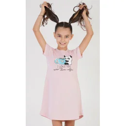 Detská nočná košeľa s krátkym rukávom Panda. Jednofarebná nočná košeľa s krátkym rukávom obsahuje obrázok medvedíka pandy s pohárom a nápis I LOVE YOU (Milujem ťa). Použitý materiál je pružný a mäkký na dotyk.