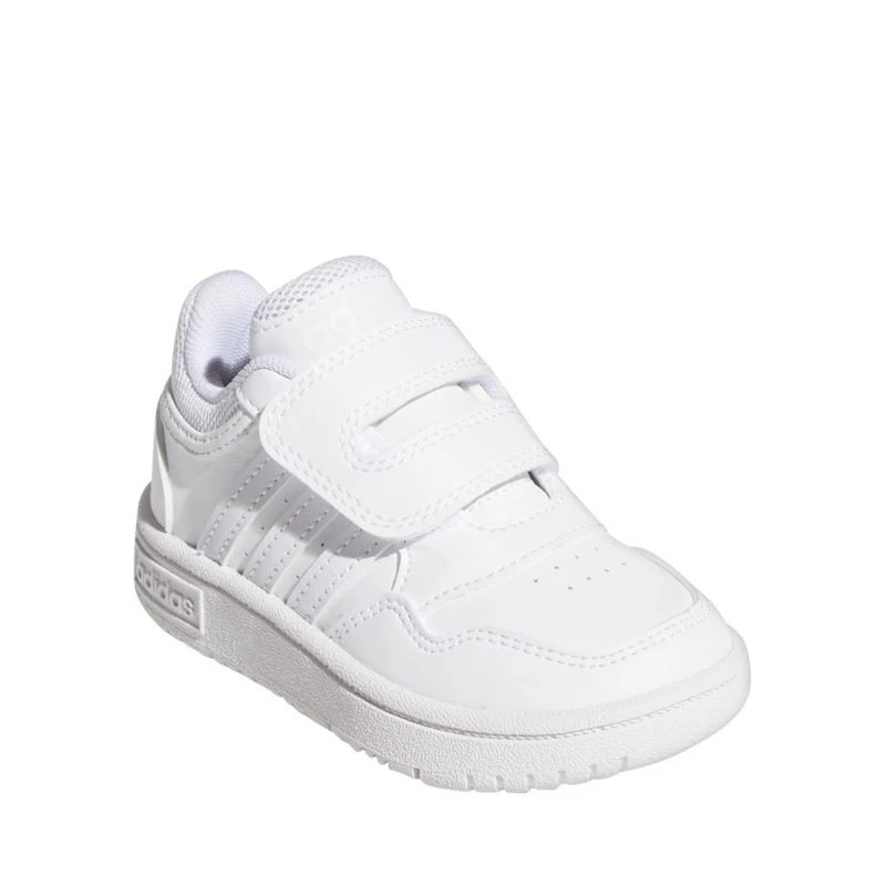 Dětské boty adidas Hoops 3.0 white GW0442 Dětské boty adidas jsou ideální pro každodenní nošení. Svršek ze syntetické kůže pohodlně odpružuje chodidlo. Textilní podšívka. Pásek na suchý zip. Měkké textilní lemování na límci. Gumová podrážka na platformě. Přilnavý došlap.