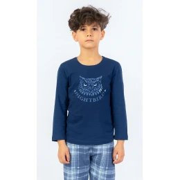 Dětské pyžamo dlouhé Sova. Dětské pyžamo se skládá z trička s dlouhým rukávem a dlouhých kalhot. Na jednobarevném tričku je obrázek soví hlavičky s nápisem Nightbird pod sebou. Dlouhé kalhoty jsou kostkované, zakončené jednobarevnými elastickými panty. Použitý materiál je jemný a poddajný na dotek. Pyžamo je vhodné i na denní nošení.