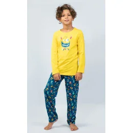Dětské pyžamo dlouhé Monster. Dětské pyžamo se skládá z trička s dlouhým rukávem a dlouhých kalhot. Na tričku je obrázek rozesmáté hladové příšerky, podobný motiv se opakuje i na dlouhých kalhotách. Použitý materiál je jemný a poddajný na dotek. Pyžamo je vhodné na denní nošení.