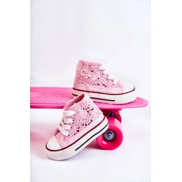 klasické tenisky z textilného materiálu. Topánky majú ažurové zdobenie. Viazanie, ktoré možno ľahko prispôsobiť šírke detskej nohy. Platforma s protišmykovou podrážkou bude ideálna na hranie. Zaoblená špička je vystužená gumovým materiálom. Vysoký top sa skvele hodí k šatám a džínsom. Vaše dieťa by malo mať v šatníku klasické tenisky. Táto obuv je pohodlná a pohodlne sa používa. pri výbere veľkosti použite tabuľku veľkostí