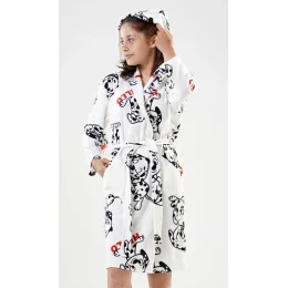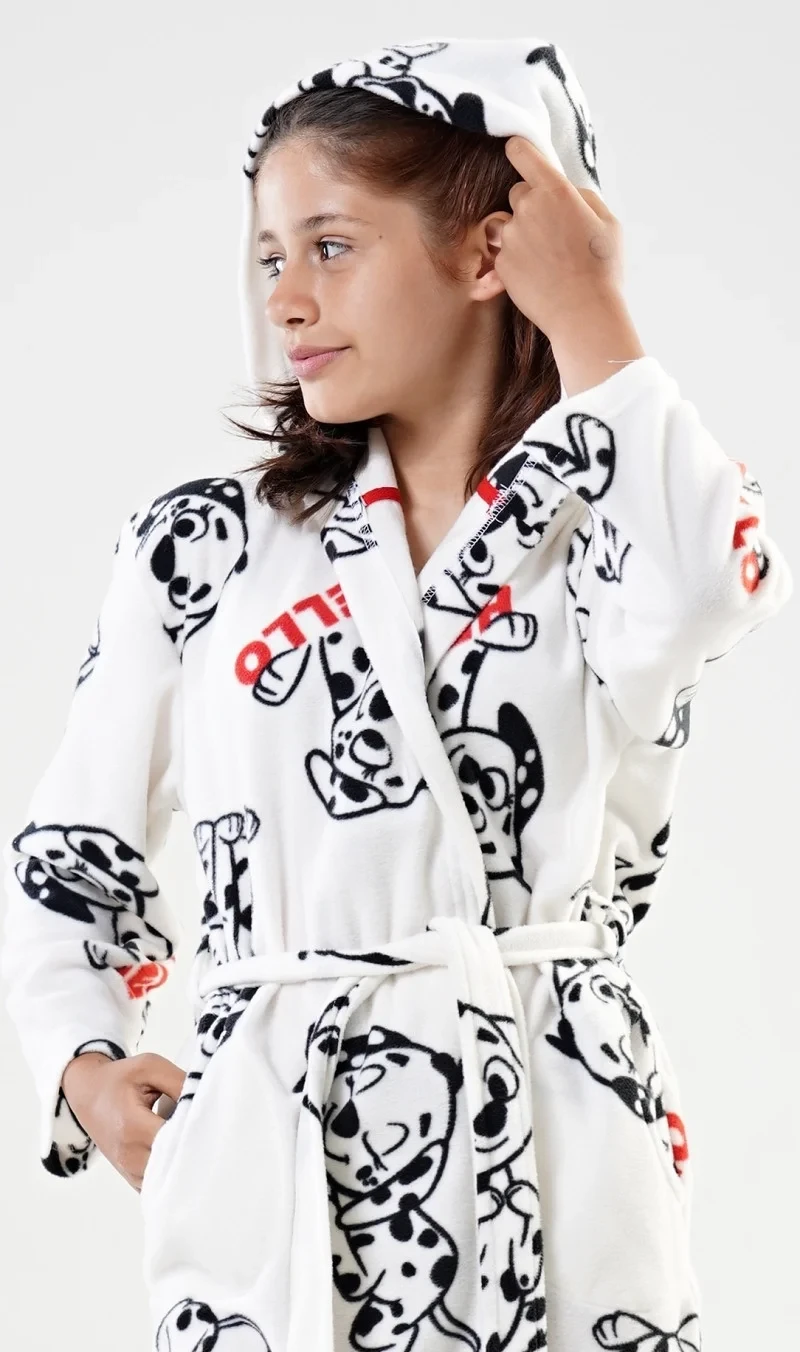 Detský flísový župan s kapucňou Dalmatín. Detský župan s kapucňou, šnúrkou na zaväzovanie a vreckami je vhodný po kúpeli a na leňošenie doma na gauči. Biela látka županu je potlačená roztomilými dalmatínmi s nápisom Hello. Materiál je mäkký a príjemný na dotyk.
