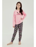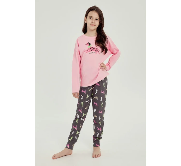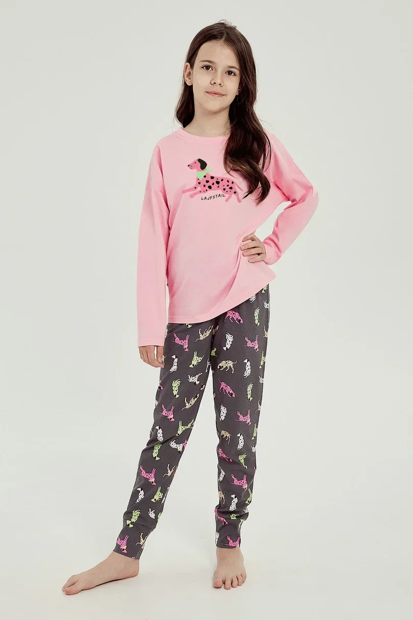Dievčenské pyžamo z vysokokvalitnej mäkkej bavlny. Tričko s dlhými rukávmi, zdobené farebnou potlačou na prednej strane. Doplnené dlhými vzorovanými nohavicami.