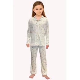Dievčenské pyžamo s dlhými rukávmi a dlhými nohavicami, rozopnuté.