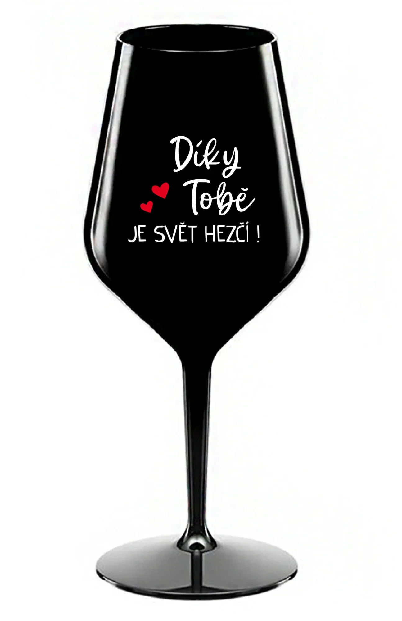 DÍKY TOBĚ JE SVĚT HEZČÍ! - černá nerozbitná sklenice na víno 470 ml