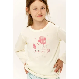Dívčí pyžamo z měkké bavlny, tričko s dlouhým rukávem a barevným potiskem na přední straně, dlouhé vzorované kalhoty s rovnými nohavicemi.