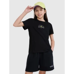 T-shirt dziewczęcy 4Fjest wykonany w 100% z bawełny, co gwarantuje wysoki komfort, trwałość i przyjemność noszenia. Okrągły dekolt wykończony jest lekkim ribem, a nadruk z motywem surferskim dodaje energii i letniego stylu.