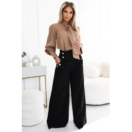 Elegantné nohavice Numoco so širokými nohavicami majú klasický dizajn ideálny na formálne a večerné príležitosti. Sú vyrobené z hladkého matného čierneho materiálu, vynikajú vysokým pásom a ozdobnými zlatými gombíkmi, ktoré im dodávajú eleganciu. Ich pohodlný a zároveň štýlový strih zaručuje pohodlné nosenie a nadčasový vzhľad. Poľský výrobok vytvorený s ohľadom na ženy, ktoré ocenia eleganciu a kvalitu.