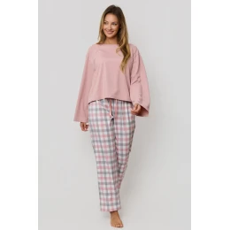 Uzupełnieniem zestawu są długie spodnie w stylową kratkę, wykonane z przyjemnej w dotyku mieszanki wiskozy. W pasie zastosowano satynową kokardkę z możliwością regulacji obwodu, dzięki czemu piżama idealnie dopasowuje się do sylwetki i daje poczucie maksymalnej wygody. Całość zapakowana jest w foliowy worek – świetnie sprawdzi się również jako prezent.