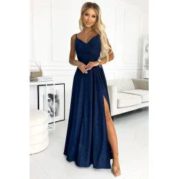 Elegantné maxi trblietavé šaty bez ramienok. Krásne tvarovaný výstrih a rozparok na sukni vytvárajú neobvyklú kompozíciu. Vyrobené z brokátovej elastickej látky v tmavo modrej farbe. Šaty ideálne na svadbu, Silvestra, ples, karneval a ďalšie významnejšie príležitosti. Vyrobené v Poľsku. Značka Numoco.