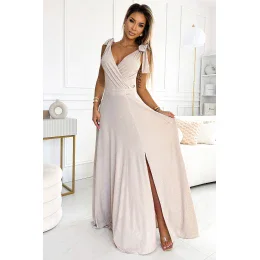 Dlhé maxi šaty so srdiečkovým výstrihom, rozparkom na nohách a mašľami na ramenách. Vyrobené z materiálu príjemného na dotyk v béžovej farbe s brokátom. Poľský výrobok. Značka numoco.