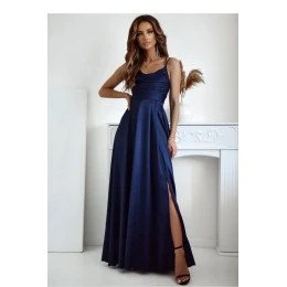 Elegantné a zároveň jednoduché dlhé šaty s rozparkom v spodnej časti. Šaty sa zapínajú na skrytý zips. Vpredu výstrih do vody s tenkými ramienkami, vzadu zaväzovanie na plátno. Skvelý dizajn na mnoho príležitostí.