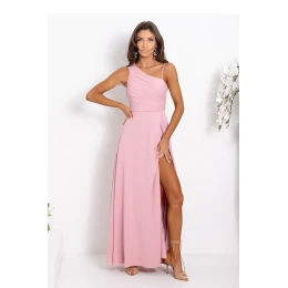Dlhé rovné šaty s asymetrickými ramienkami, jedným tenkým, druhým hrubším. Šaty sú v páse stiahnuté, spodná časť je kvetovaná. Šaty sa zapínajú na skrytý zips na boku. Ozdobný rozparok na chrbte s pletenými viazankami.