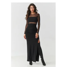 Vstupte do světa elegance, který hypnotizuje už na první pohled. Tato černá maxi šaty s síťkovaným materiálem jsou nabídkou pro ženy, které se nebojí zářit a chtějí se cítit naprosto výjimečně. Přiléhavý střih perfektně zdůrazňuje postavu, zatímco jemné záhyby v pasu formují siluetu, dodávají jí smyslnou lehkost. Průhledný vršek z jemné síťky dává šatům tajemný charakter, kde se elegance setkává s odvahou. Navíc pod tylem je samostatný top, který můžete použít i k jiným stylizacím. Smyslný rozpark odkrývá nohu s každým krokem, přidávající celku ženský magnetismus. Zlatý knoflík na zádech nejen plní praktickou funkci, ale také jim dodává bižuterní charakter, krásně kontrastující s hlubokou černí materiálu. Tento jemný akcent činí šaty luxusně vypadajícími a zároveň je jedinečnými v každém detailu. To nejsou obyčejné večerní šaty, je to kreace, ve které pocítíte, že všechny pohledy jsou upřeny přímo n