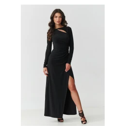 Tieto čierne maxi šaty z elastického materiálu sú dokonalým spojením elegancie a modernosti. Strih na mieru krásne zvýrazňuje postavu a asymetrický rozparok na nohách dodáva nádych ženskej elegancie a sexepílu. Jemný výstrih a dlhé rukávy robia z tohto modelu ideálnu voľbu na elegantné večierky, plesy alebo romantické večere. Tieto šaty sú vyrobené z kvalitného materiálu, sú nielen efektné, ale aj veľmi pohodlné, mierne elastické, mäkké a nemačkavé