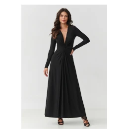Oslňte eleganciou a ženskosťou v jedinečných maxi šatách s hlbokým srdcovým výstrihom a jemným začínaním v páse. Je to model, ktorý krásne zvýrazní postavu a zároveň si zachová triedu a ľahkosť. Dlhé rukávy a splývavý, mäkký materiál zaručujú, že šaty krásne sedia a poskytujú pohodlie počas celého dňa. Tieto dlhé šaty sú ideálnou voľbou na špeciálnu príležitosť svadby, dovolenky, večere vo dvojici alebo elegantný večierok. Začínanie v páse opticky zjemňuje postavu a rozšírený spodný diel s rozparkom pri pohybe krásne padá, čím vytvára efekt WOW. K dispozícii v čiernej farbe. Predveďte štýl a sebavedomie v šatách, ktoré spájajú nadčasovú eleganciu s moderným šarmom.
