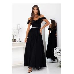 Černé večerní šaty s rozparkem a odhalenými rameny jsou kvintesencí elegance a ženskosti. Vyrobené z lehkého, vzdušného materiálu se krásně přizpůsobují postavě, zdůrazňují pas a zeštíhlují postavu. Model má jemně padající ramínka typu off shoulder, která jemně zdůrazňují ramena a výstřih. Hluboký rozpark na noze dodává kreaci smyslný charakter, a přiléhavý korzet a tenký lesklý pás dodávají celku jedinečného kouzla. Zvláštním ozdobným prvkem těchto šatů je dekorativní pás zapínající se na knoflíky, který efektně zdůrazňuje pas. Pás je zdobený třpytivými detaily, díky čemuž přidává kreaci jedinečný, bižuterní akcent a přitahuje pohled jemným zářením. Tyto černé dlouhé šaty z tylu se skvěle hodí na svatbu, ples, maturitní ples, Silvestra nebo jinou elegantní akci. Sladí se s podpatky a jemným šperkem, abyste vytvořili nadčasový, ženský outfit.