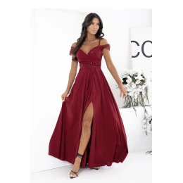 Elegantní maxi šaty v bordové barvě, vytvořené s ohledem na výjimečné příležitosti. Model s ženským, přizpůsobeným střihem, který krásně zdůrazňuje pas a zjemňuje postavu. Vrchní část šatů ohromuje překříženým výstřihem ve tvaru písmene V, který decentně zdůrazňuje poprsí. Odkryté ramena zdobí jemné, flitrové rukávy, které dodávají celku lesk a večerní charakter. Tenká ramínka zajistí stabilitu a pohodlí nošení. V pasu je použit ozdobný pásek s flitrovým zakončením, který efektně zdůrazňuje proporce postavy. Dlouhá, lehce rozkročená sukně vyrobená z tekoucí látky krásně padne do pohybu, a vysoký rozpark na noze přidává smyslnosti a lehkosti. Šaty se zapínají vzadu na skrytý zip, což zaručuje ideální přizpůsobení a estetické zakončení. Ideální volba na: svatbu, ples, maturitní ples, společenské události, elegantní večerní vycházky.