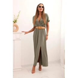Dlouhá šaty s ozdobným pásem model 22038583 khaki - K-Fashion
