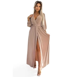 Dlouhé béžové dámské šaty se širokým opaskem a výstřihem model 21876183 - numoco basic