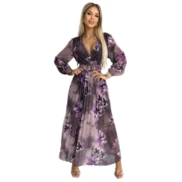 Dlouhé dámské plisované šifonové šaty s výstřihem, dlouhými rukávy, širokým opaskem a se vzorem květů model 19350644 - numoco basic