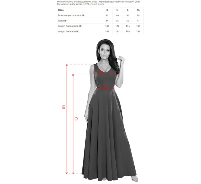 Modelka na fotografii je vysoká 170 cm a predvádza šaty vo veľkosti S.